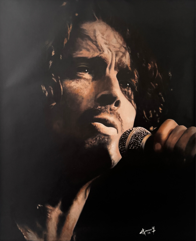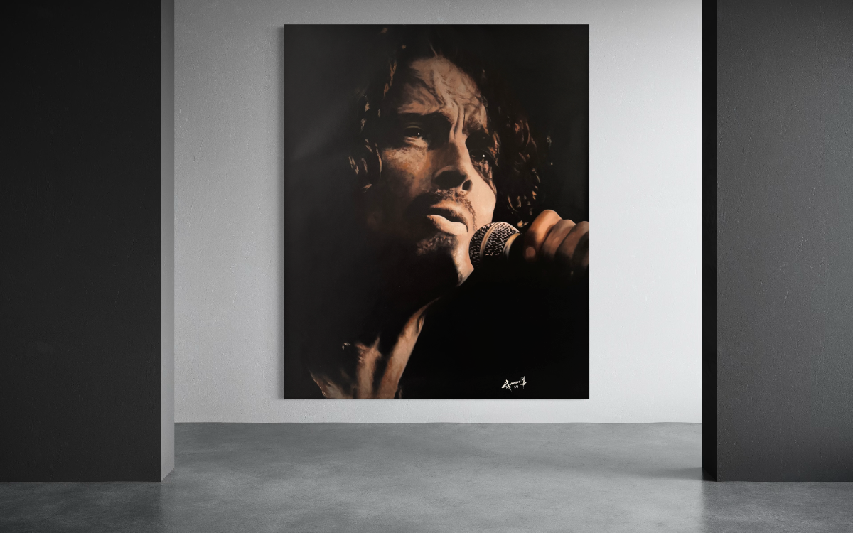 Un retrato impactante de Chris Cornell, cuya voz poderosa y emocional definió el sonido de Soundgarden y Audioslave. Las sombras y la intensidad de su expresión reflejan la profundidad de su música y el legado imborrable que dejó en el grunge.