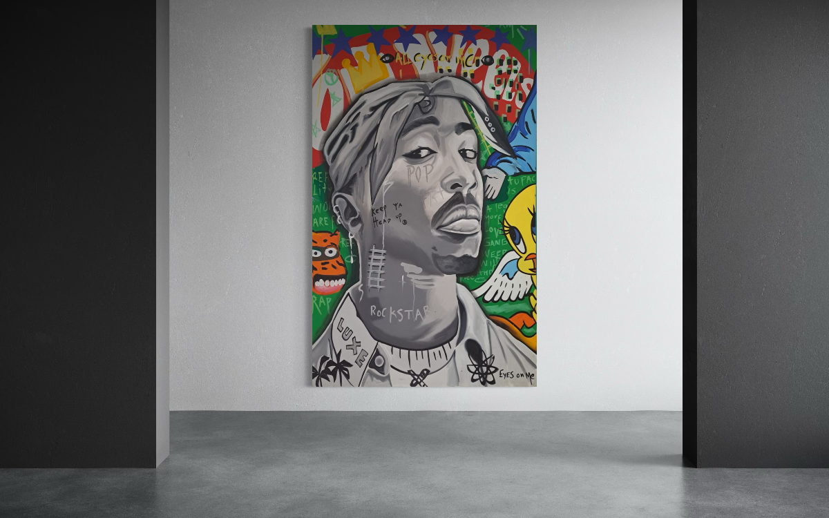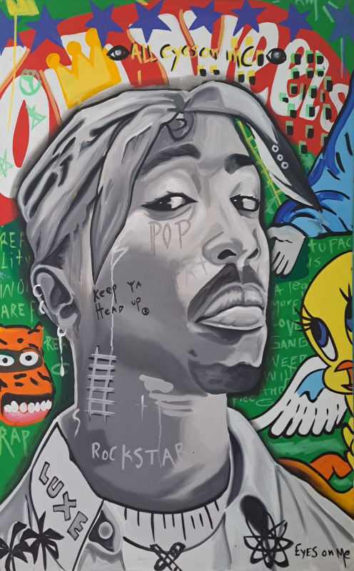 Este cuadro rinde homenaje a Tupac Shakur, una de las figuras más influyentes del rap. Con un fondo lleno de arte urbano y símbolos de su legado, la obra refleja la dualidad de su rebeldía y poesía, capturando la esencia del movimiento Thug Life.